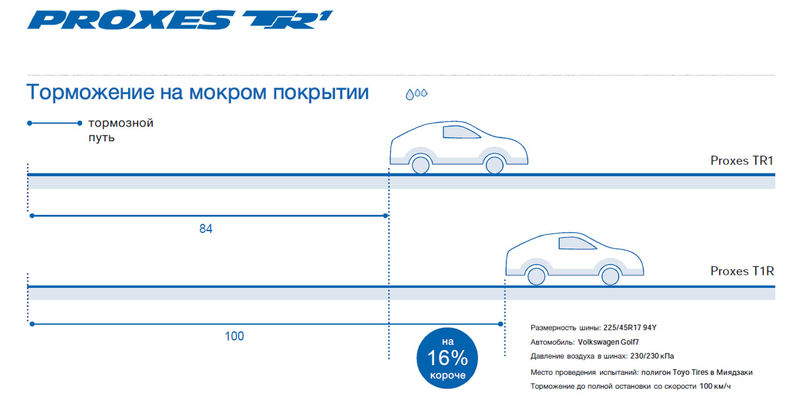 Более того, на мокром асфальте шины Proxes TR1 проявили улучшенные сцепные свойства: их тормозной путь оказался на 16% короче, чем у шин Proxes T1R предыдущего поколения. Лучше стала и маневренность на мокром покрытии. Например, «змейка» была пройдена на очень высокой скорости. При этом сопротивление качению снизилось на 10%, благодаря чему автомобиль кажется более легким и послушным.